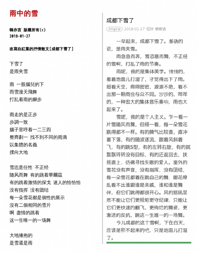 essay 'It's Snowing In Chengdu' by Hongye, as shown in