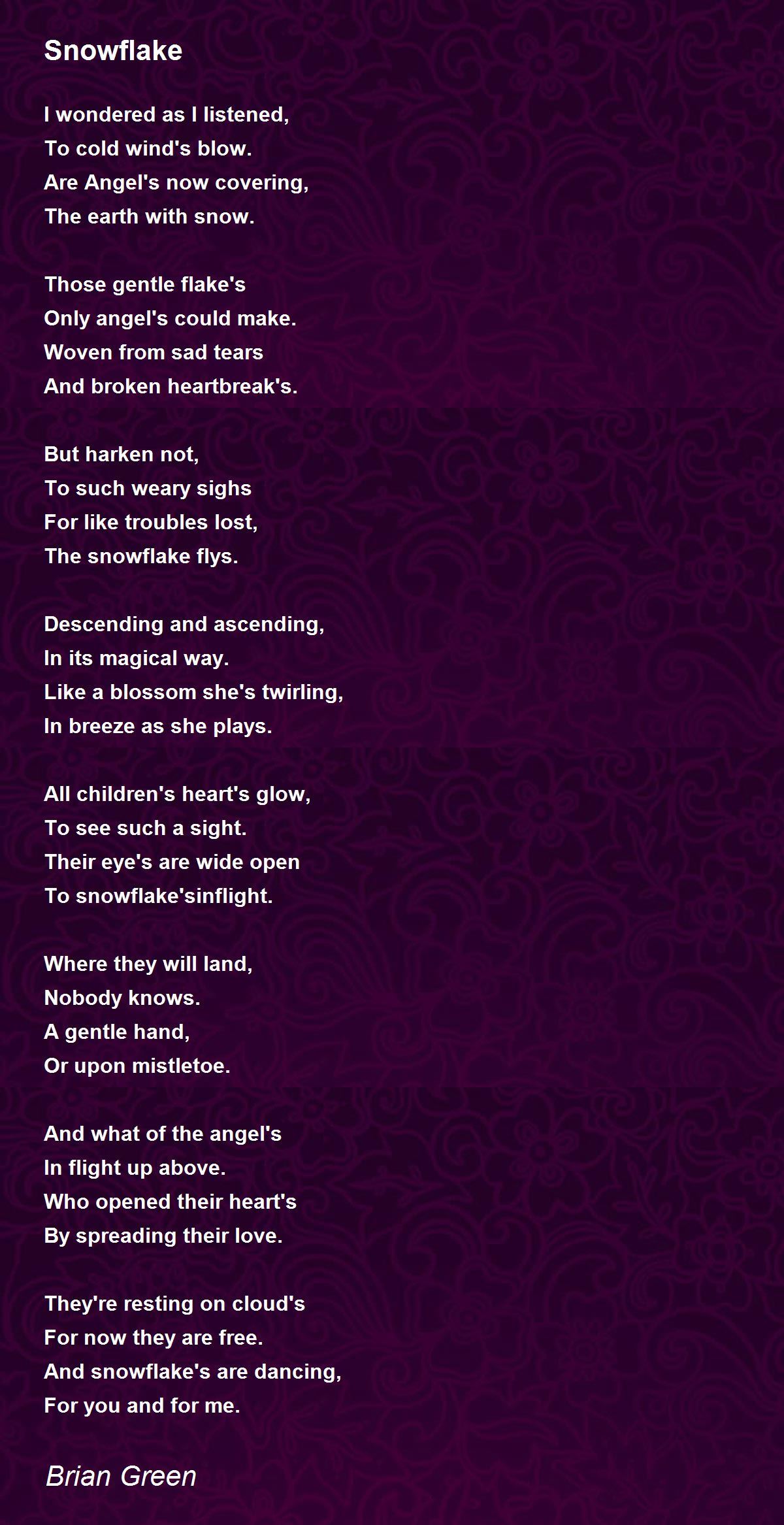 Those gentle flake's Only angel's could make. Woven from sad tears And broken heartbreak's....look my child, the snowflakes are dancing for you and me...... look the angels are flying..... in between the stars and from the stars and the skies the angels send us snowflakes. so pure we should be like the snowflakes teaching us thus a lesson. tony