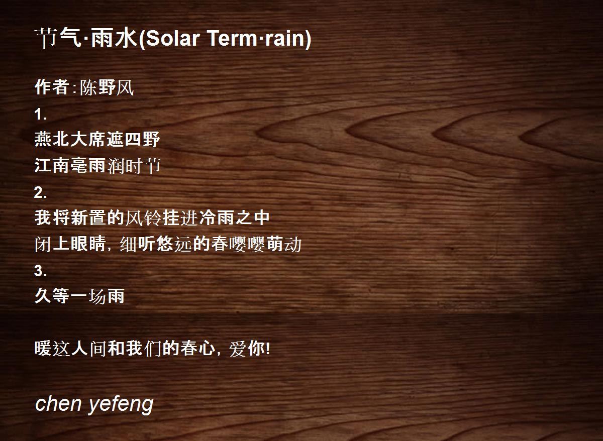 作者:陈野风1.燕北大席遮四野江南毫雨润时节2.我将新置的风铃挂进冷雨之中闭上眼睛,细听悠远的春嘤嘤萌动3.久等一场雨暖这人间和我们的春心,爱你!