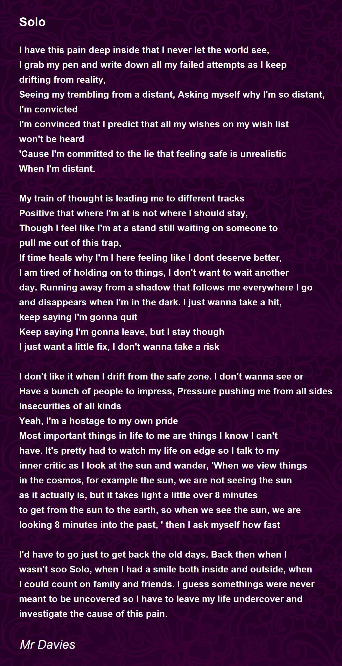 Most important things in life to me are things I know I can't have. It's pretty had to watch my life on edge so I talk to my inner critic as I look at the sun and wander, 'When we view things in the cosmos, for example the sun, we are not seeing the sun as it actually is, but it takes light a little over 8 minutes to get from the sun to the earth, so when we see the sun, we are looking 8 minutes into the past, ' then I ask myself how fast I'd have to go just to get back the old days. Back then when I wasn't soo Solo, when I had a smile both inside and outside, when I could count on family and friends. I guess somethings were never meant to be uncovered so I have to leave my life undercover and investigate the cause of this pain.
