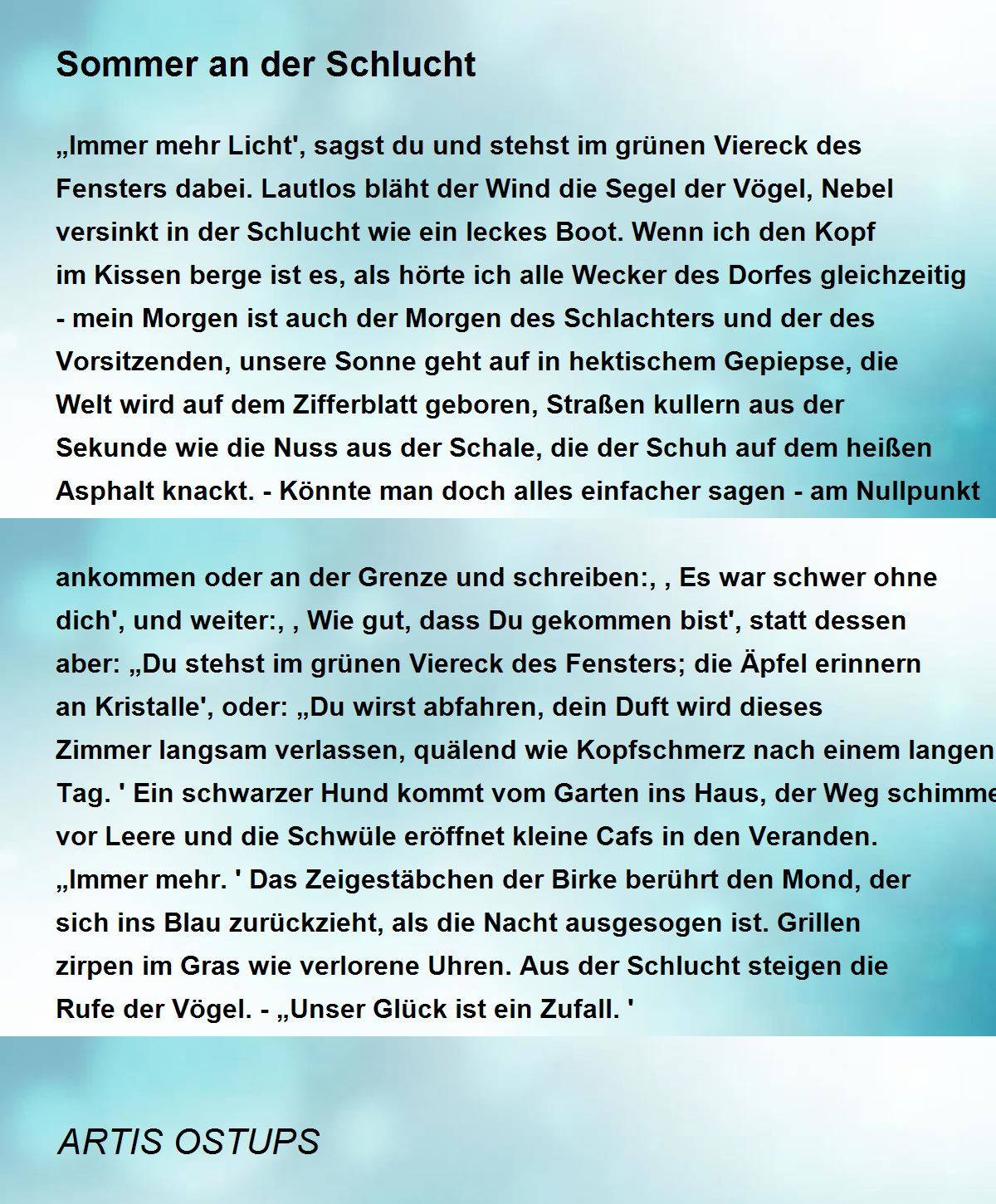 „Immer mehr Licht', sagst du und stehst im grünen Viereck des Fensters dabei. Lautlos bläht der Wind die Segel der Vögel, Nebel versinkt in der Schlucht wie ein leckes Boot. Wenn ich den Kopf im Kissen berge ist es, als hörte ich alle Wecker des Dorfes gleichzeitig - mein Morgen ist auch der Morgen des Schlachters und der des Vorsitzenden, unsere Sonne geht auf in hektischem Gepiepse, die Welt wird auf dem Zifferblatt geboren, Straßen kullern aus der Sekunde wie die Nuss aus der Schale, die der Schuh auf dem heißen Asphalt knackt. - Könnte man doch alles einfacher sagen - am Nullpunkt ankommen oder an der Grenze und schreiben:,,Es war schwer ohne dich', und weiter:,,Wie gut, dass Du gekommen bist', statt dessen aber: „Du stehst im grünen Viereck des Fensters; die Äpfel erinnern an Kristalle', oder: „Du wirst abfahren, dein Duft wird dieses Zimmer langsam verlassen, quälend wie Kopfschmerz nach einem langen Tag.' Ein schwarzer Hund kommt vom Garten ins Haus, der Weg schimmert vor Leere und die Schwüle eröffnet kleine Cafs in den Veranden. „Immer mehr.' Das Zeigestäbchen der Birke berührt den Mond, der sich ins Blau zurückzieht, als die Nacht ausgesogen ist. Grillen zirpen im Gras wie verlorene Uhren. Aus der Schlucht steigen die Rufe der Vögel. -„Unser Glück ist ein Zufall.'