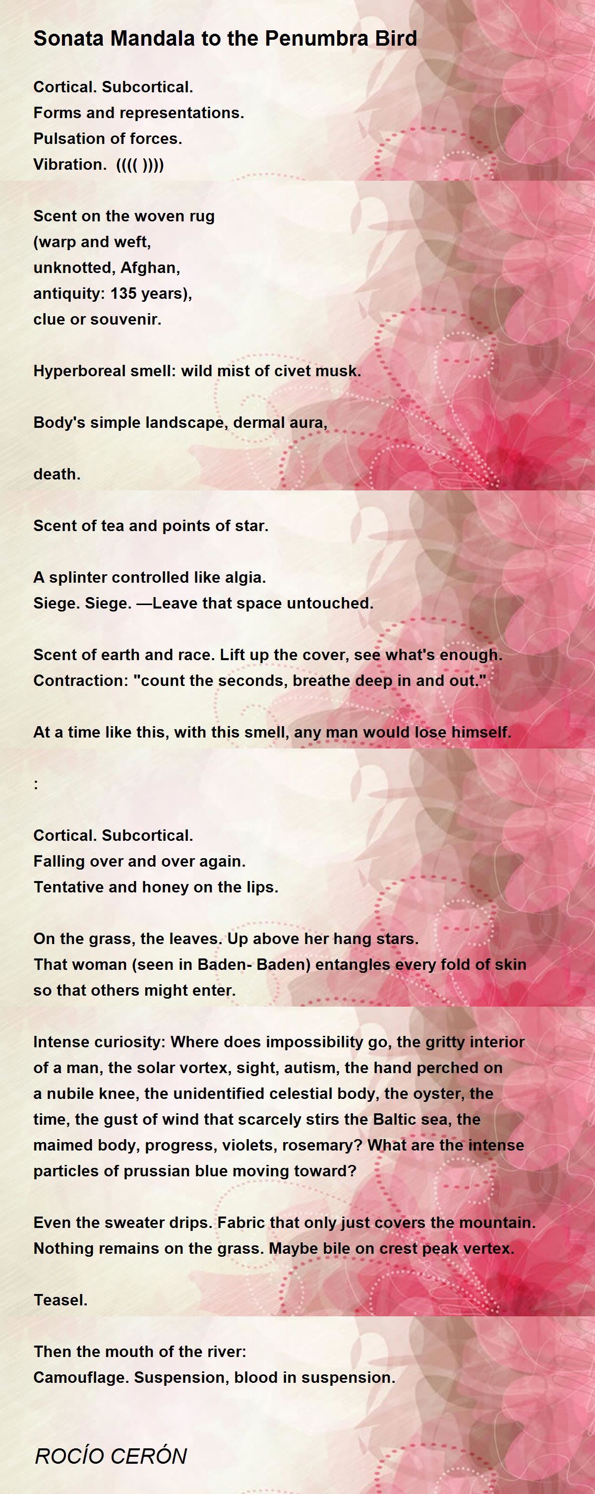 Sonata resounding through bedrooms: andthebirdsenterinthelips, aural mandala. Bird maw. Hypodermic. Space bird. Aurora borealis. System. The most beautiful. Cellophane bird. Upright. Clump of marsh marigold. Ditch bird. Metal dishes. Opal bird. Ball of purple yarn. Net and plumage buried in blood.
