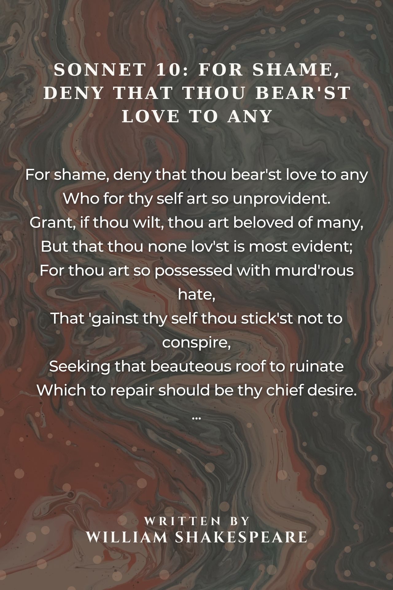 This is a procreation sonnet within the Fair Youth sequence. In the sonnet, Shakespeare uses a rather harsh tone to admonish the young man for his refusal to fall in love and have children. It also continues and amplifies the theme of hatred against the world which appears rather suddenly in the last couplet of Sonnet 9. The two sonnets may be said therefore to be linked (like Sonnets 5 and 6 or Sonnets 15 and 16) even though the linkage takes a different form. [from Wikipedia]