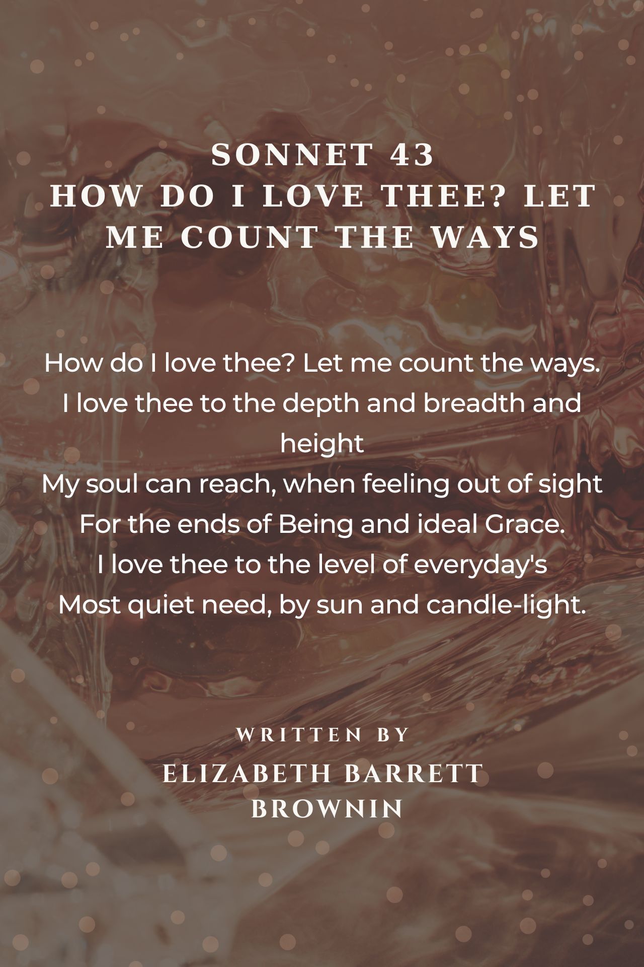 The same as HOW DO I LOVE THEE Poem, also by EBB. This is a WOW-Poem, means, most beautiful, most touching and most read by readers, since it is such a terrific bestest poem, created by EBB and inspired of course by her husband. A supertalented lady, a woman of all periods and ages, a true immortal poem from the very start. EBB is a very learned woman and despite her constant pains, God has given her many talents, as we all know. A poem full of superlatives to be mentioned.