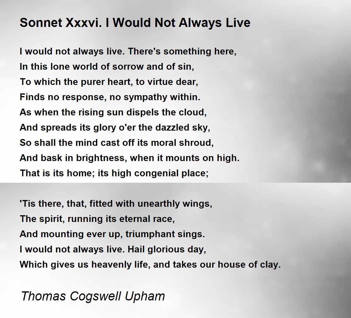 I would not always live. Hail glorious day,
