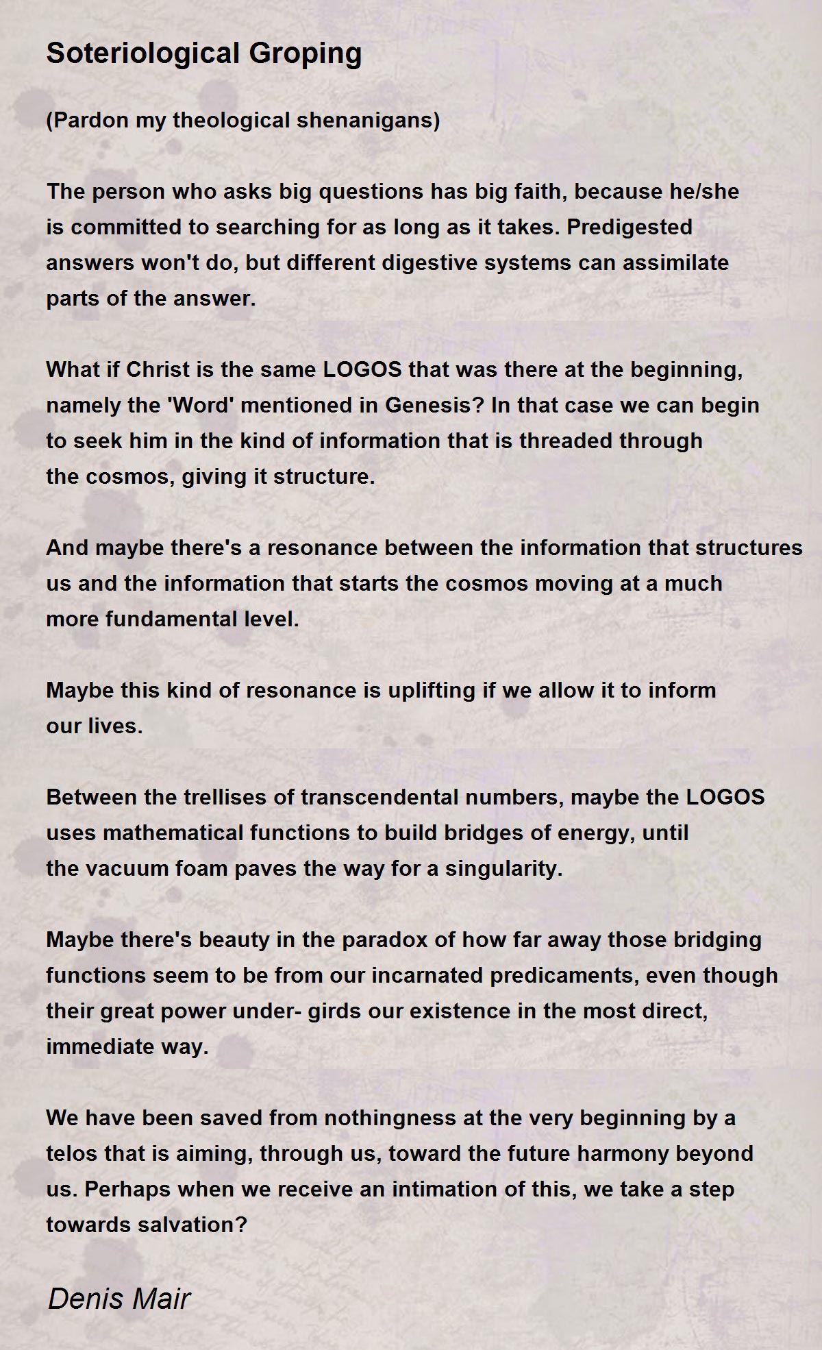 I wrote the poem, 'The LOGOS Effect: Spoken Into Creation', inspired by the poem 'Soteriological Groping', by the poet Denis Mair and dedicated to Denis Mair.