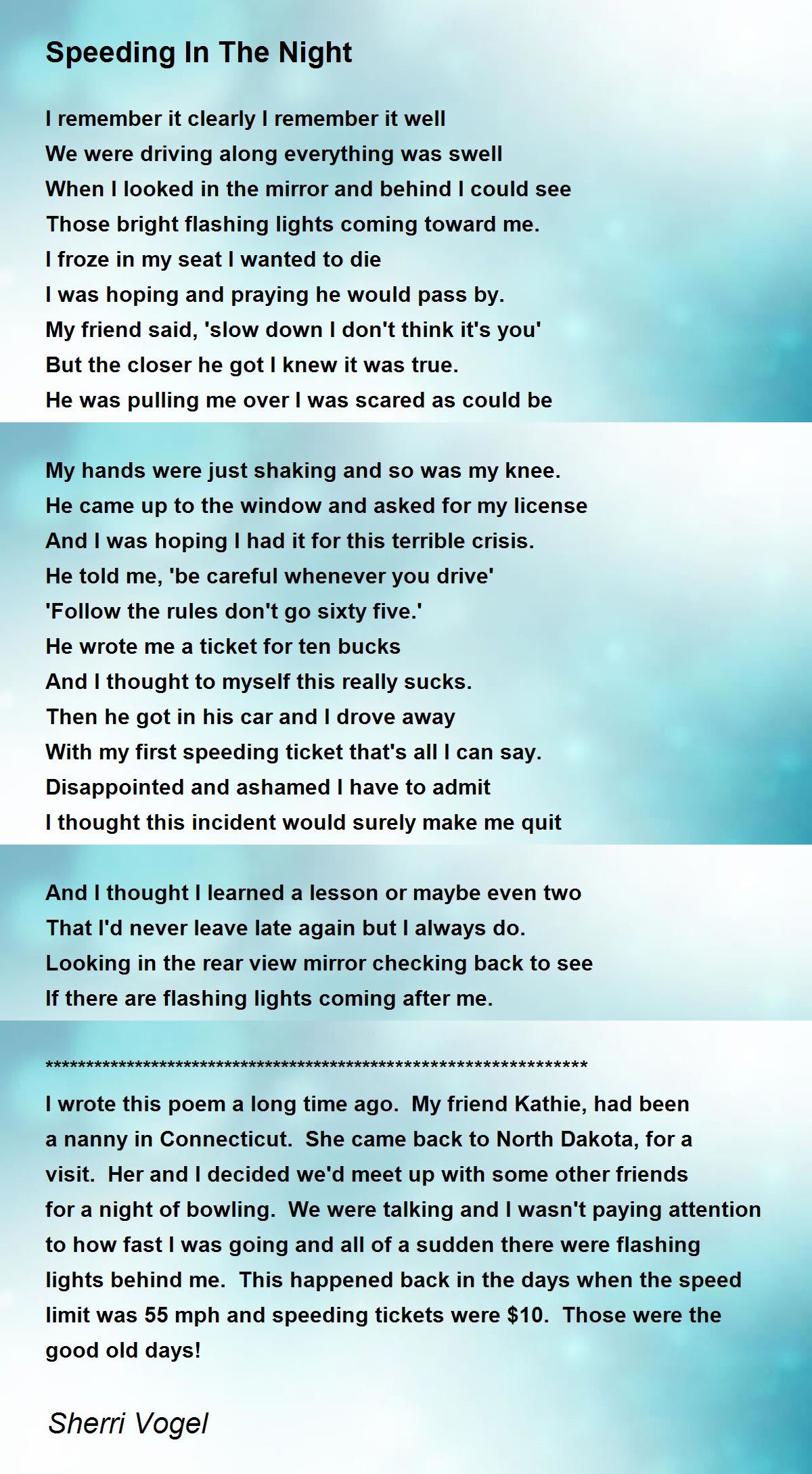 I wrote this poem a long time ago. My friend Kathie, had been a nanny in Connecticut. She came back to North Dakota, for a visit. Her and I decided we'd meet up with some other friends for a night of bowling. We were talking and I wasn't paying attention to how fast I was going and all of a sudden there were flashing lights behind me. This happened back in the days when the speed limit was 55 mph and speeding tickets were $10. Those were the good old days!