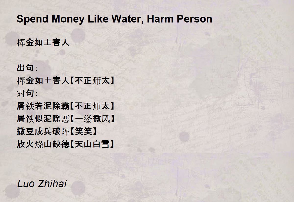 挥金如土害人 出句: 挥金如土害人【不正师太】 对句: 屑铁若泥除霸【不正师太】 屑铁似泥除恶【一缕微风】 撒豆成兵破阵【笑笑】 放火烧山缺德【天山白雪】