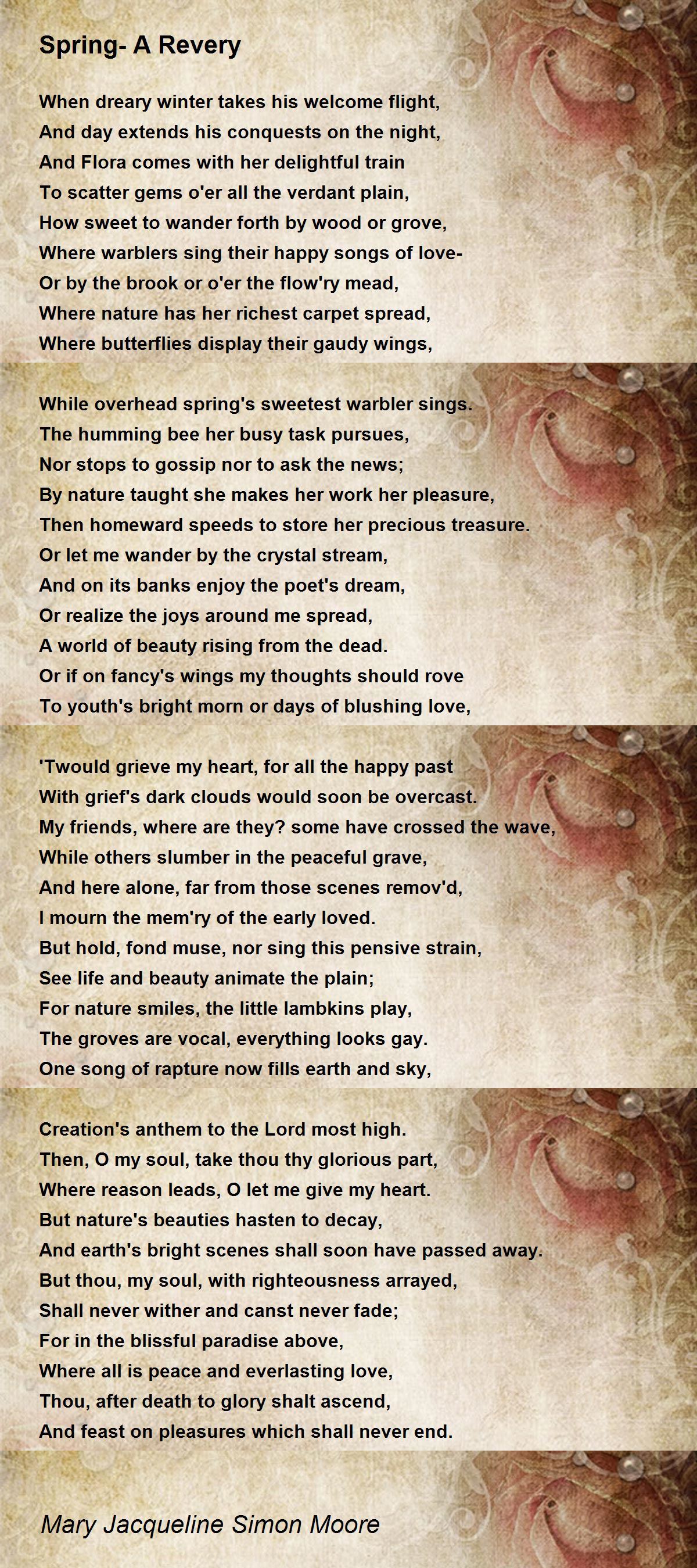 While overhead spring's sweetest warbler sings.