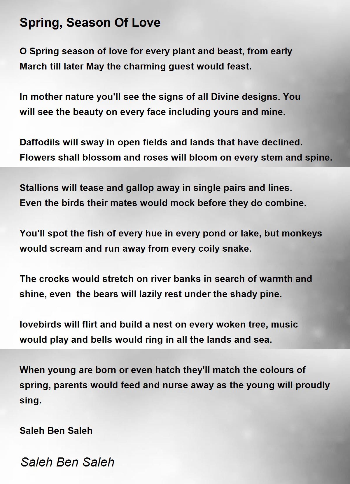 O Spring season of love for every plant and beast, from early March till later May the charming guest would feast.