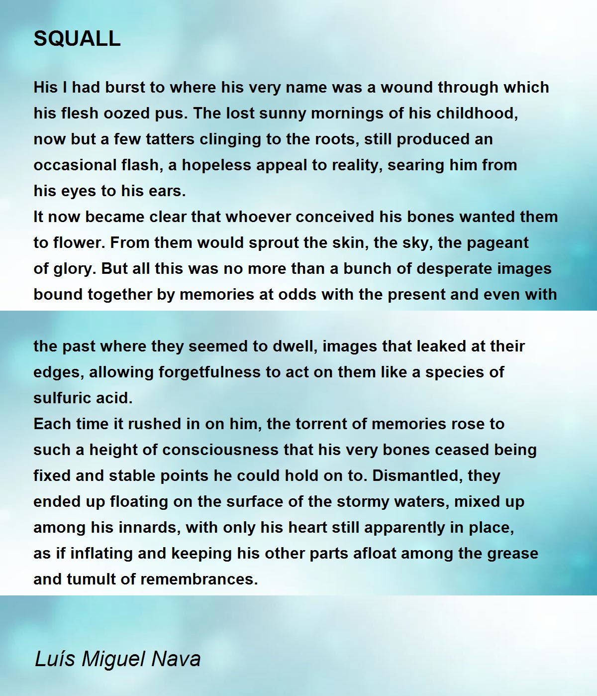Each time it rushed in on him, the torrent of memories rose to such a height of consciousness that his very bones ceased being fixed and stable points he could hold on to. Dismantled, they ended up floating on the surface of the stormy waters, mixed up among his innards, with only his heart still apparently in place, as if inflating and keeping his other parts afloat among the grease and tumult of remembrances.
