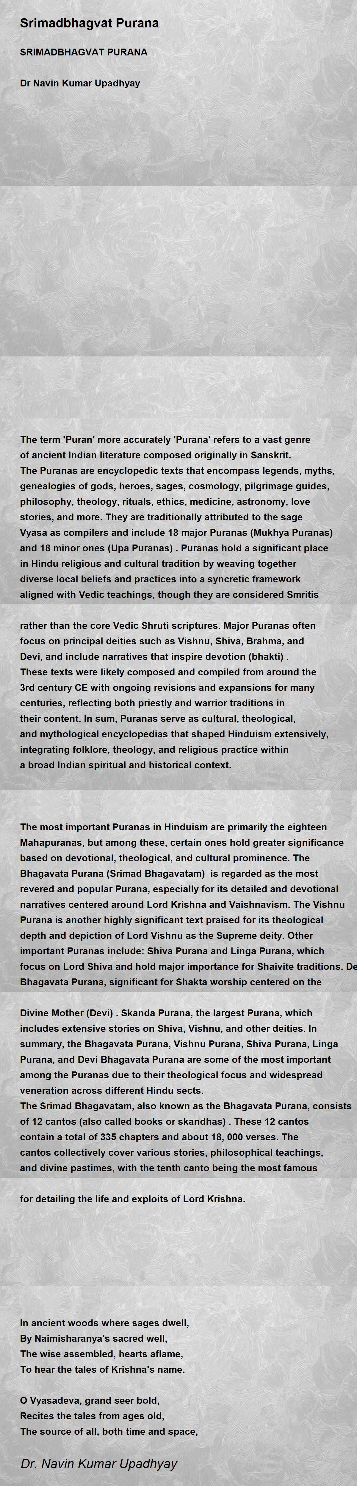 Evaluates Bhagavatam as a Mahakavya (epic poetry) , adding to academic discourse on its metrical beauty, narrative structure, and motivational poetic power for readers and researchers