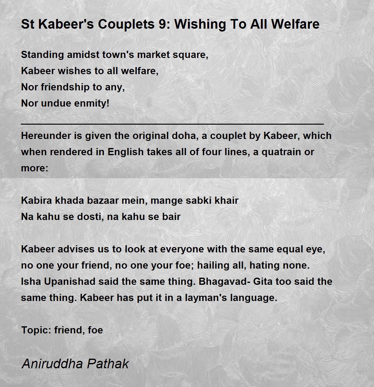 Hereunder is given the original doha, a couplet by Kabeer, which when rendered in English takes all of four lines, a quatrain or more: