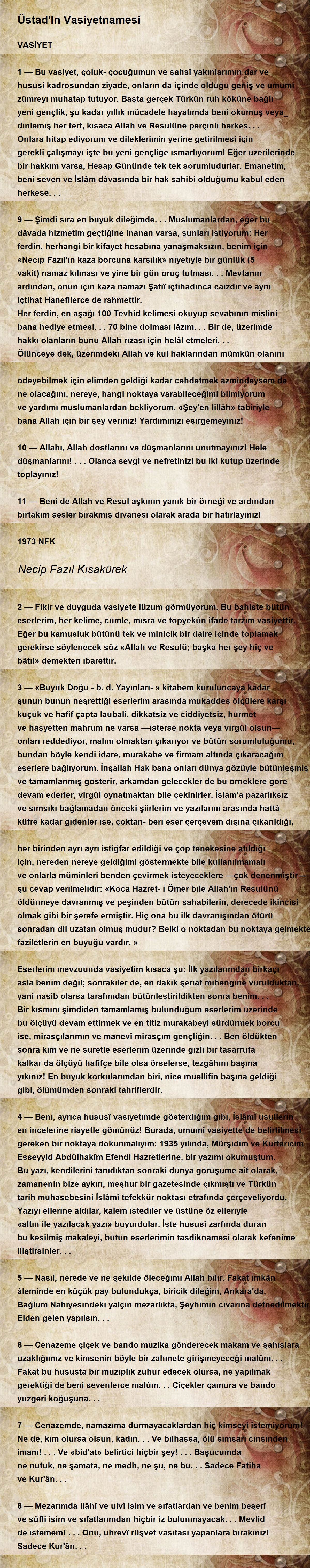 1 — Bu vasiyet, çoluk-çocuğumun ve şahsî yakınlarımın dar ve hususî kadrosundan ziyade, onların da içinde olduğu geniş ve umumî zümreyi muhatap tutuyor. Başta gerçek Türkün ruh köküne bağlı yeni gençlik, şu kadar yıllık mücadele hayatımda beni okumuş veya_ dinlemiş her fert, kısaca Allah ve Resulüne perçinli herkes... Onlara hitap ediyorum ve dileklerimin yerine getirilmesi için gerekli çalışmayı işte bu yeni gençliğe ısmarlıyorum! Eğer üzerilerinde bir hakkım varsa, Hesap Gününde tek tek sorumludurlar. Emanetim, beni seven ve İslâm dâvasında bir hak sahibi olduğumu kabul eden herkese...