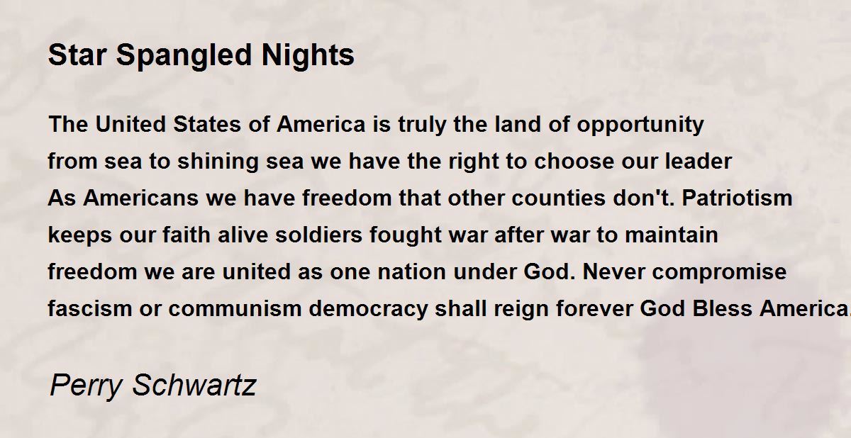 The United States of America is truly the land of opportunity from sea to shining sea we have the right to choose our leader As Americans we have freedom that other counties don't. Patriotism keeps our faith alive soldiers fought war after war to maintain freedom we are united as one nation under God. Never compromise fascism or communism democracy shall reign forever God Bless America.