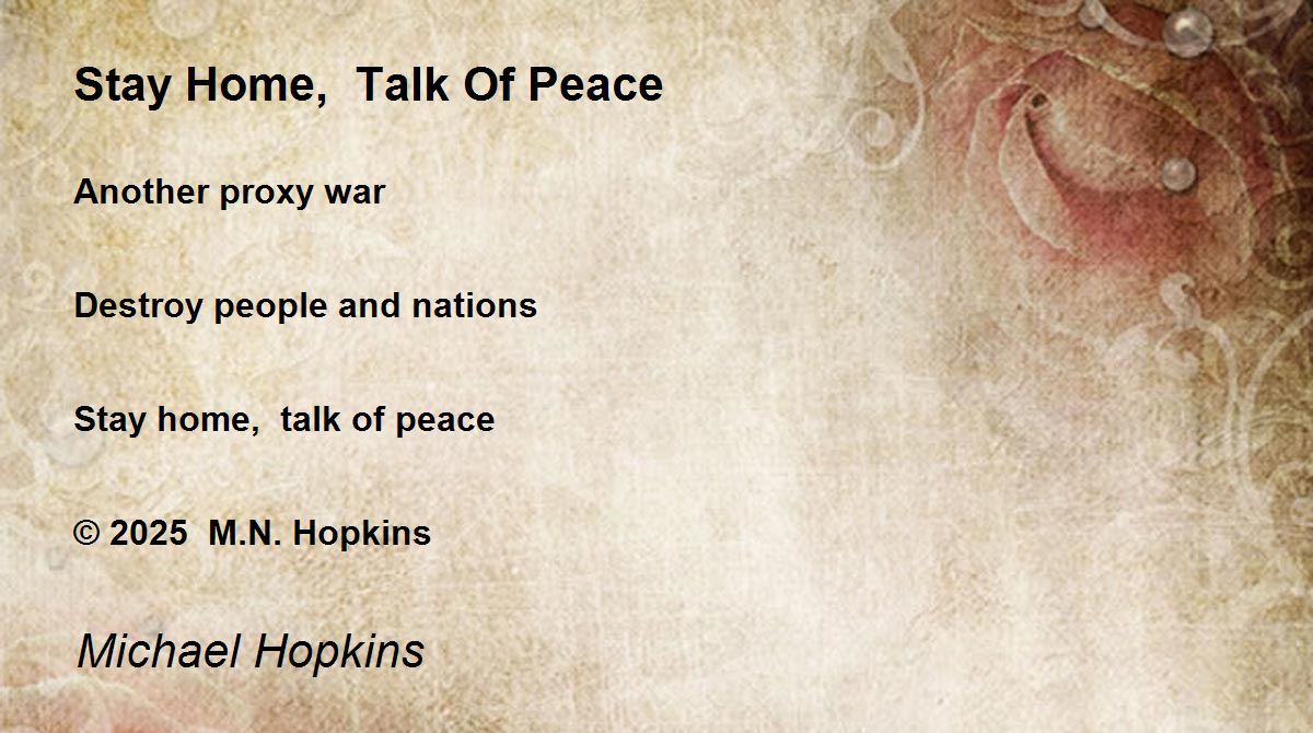 Another proxy war Destroy people and nations Stay home, talk of peace © 2025 M.N. Hopkins