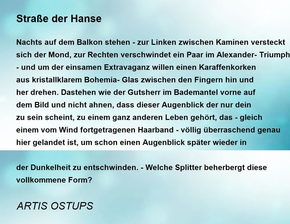 Nachts auf dem Balkon stehen - zur Linken zwischen Kaminen versteckt sich der Mond, zur Rechten verschwindet ein Paar im Alexander-Triumphbogen - und um der einsamen Extravaganz willen einen Karaffenkorken aus kristallklarem Bohemia-Glas zwischen den Fingern hin und her drehen. Dastehen wie der Gutsherr im Bademantel vorne auf dem Bild und nicht ahnen, dass dieser Augenblick der nur dein zu sein scheint, zu einem ganz anderen Leben gehört, das - gleich einem vom Wind fortgetragenen Haarband - völlig überraschend genau hier gelandet ist, um schon einen Augenblick später wieder in der Dunkelheit zu entschwinden. - Welche Splitter beherbergt diese vollkommene Form?