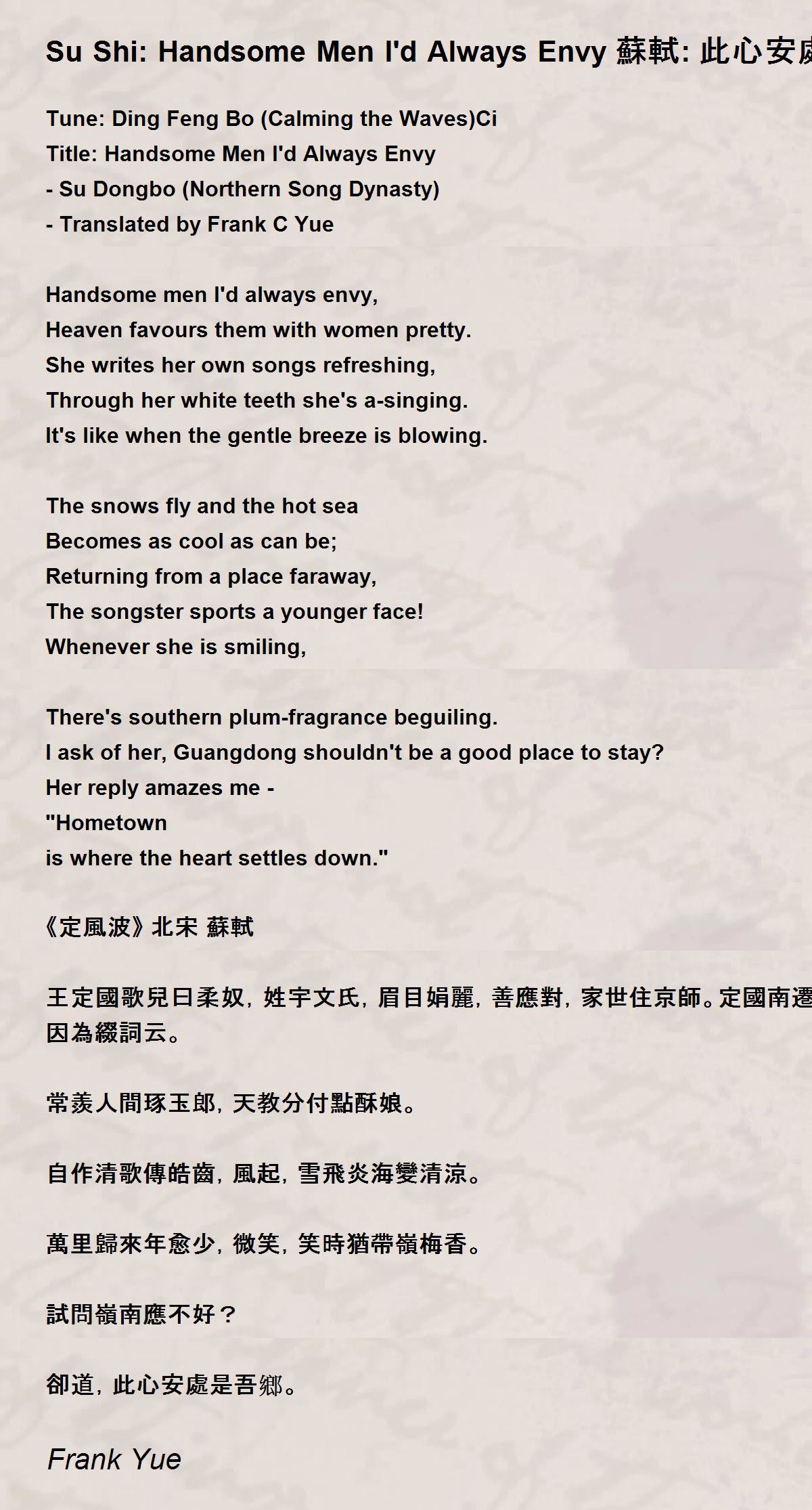王定國歌兒曰柔奴,姓宇文氏,眉目娟麗,善應對,家世住京師。定國南遷歸,余問柔:"廣南風土,應是不好?"柔對曰:"此心安處,便是吾鄉。" 因為綴詞云。