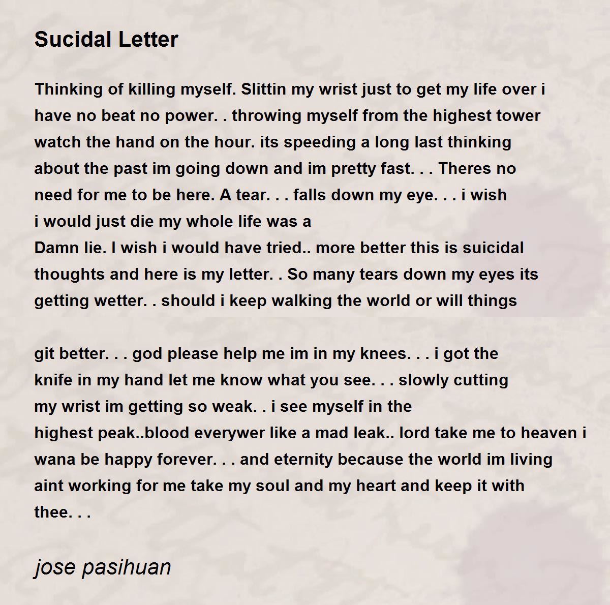 thoughts and here is my letter.. So many tears down my eyes its getting wetter..should i keep walking the world or will things git better...god please help me im in my knees...i got the knife in my hand let me know what you see...slowly cutting my wrist im getting so weak..i see myself in the
