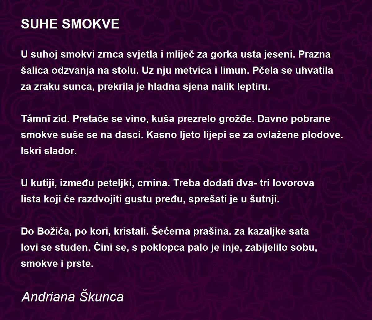 U suhoj smokvi zrnca svjetla i mliječ za gorka usta jeseni. Prazna šalica odzvanja na stolu. Uz nju metvica i limun. Pčela se uhvatila za zraku sunca, prekrila je hladna sjena nalik leptiru.