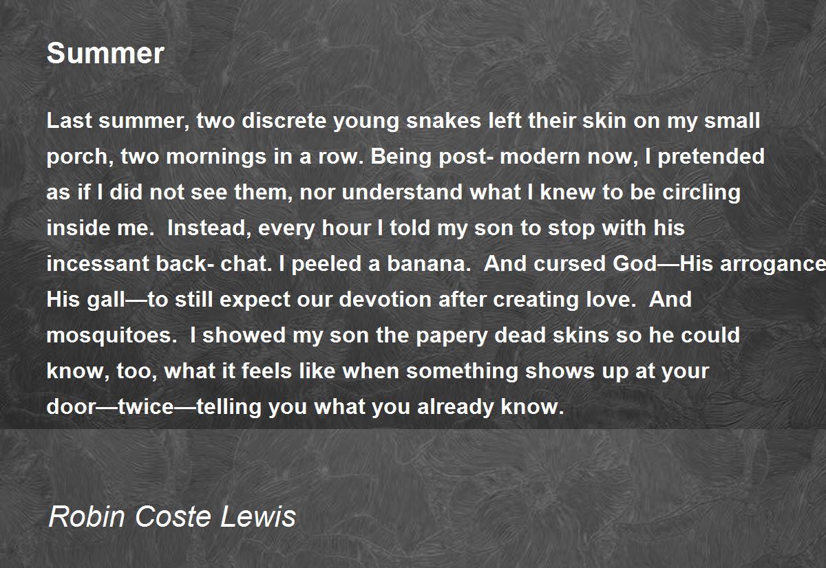 Last summer, two discrete young snakes left their skin on my small porch, two mornings in a row. Being post-modern now, I pretended as if I did not see them, nor understand what I knew to be circling inside me. Instead, every hour I told my son to stop with his incessant back-chat. I peeled a banana. And cursed God—His arrogance, His gall—to still expect our devotion after creating love. And mosquitoes. I showed my son the papery dead skins so he could know, too, what it feels like when something shows up at your door—twice—telling you what you already know.