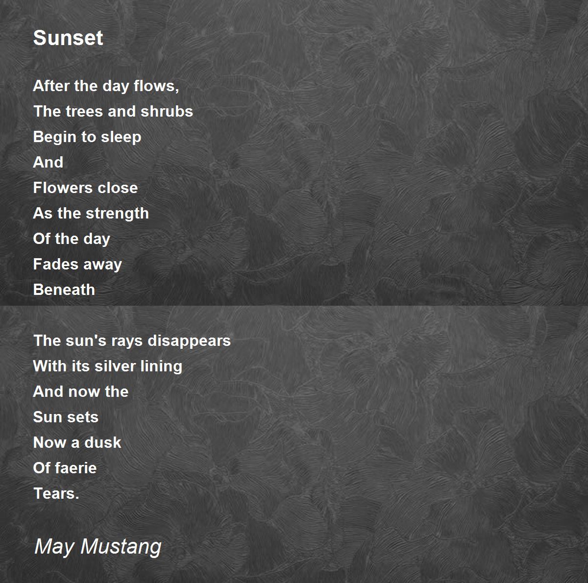 The sun's rays disappears With its silver lining And now the Sun sets Now a dusk Of faerie Tears. the diety of poesy lives in you dear poet. tony