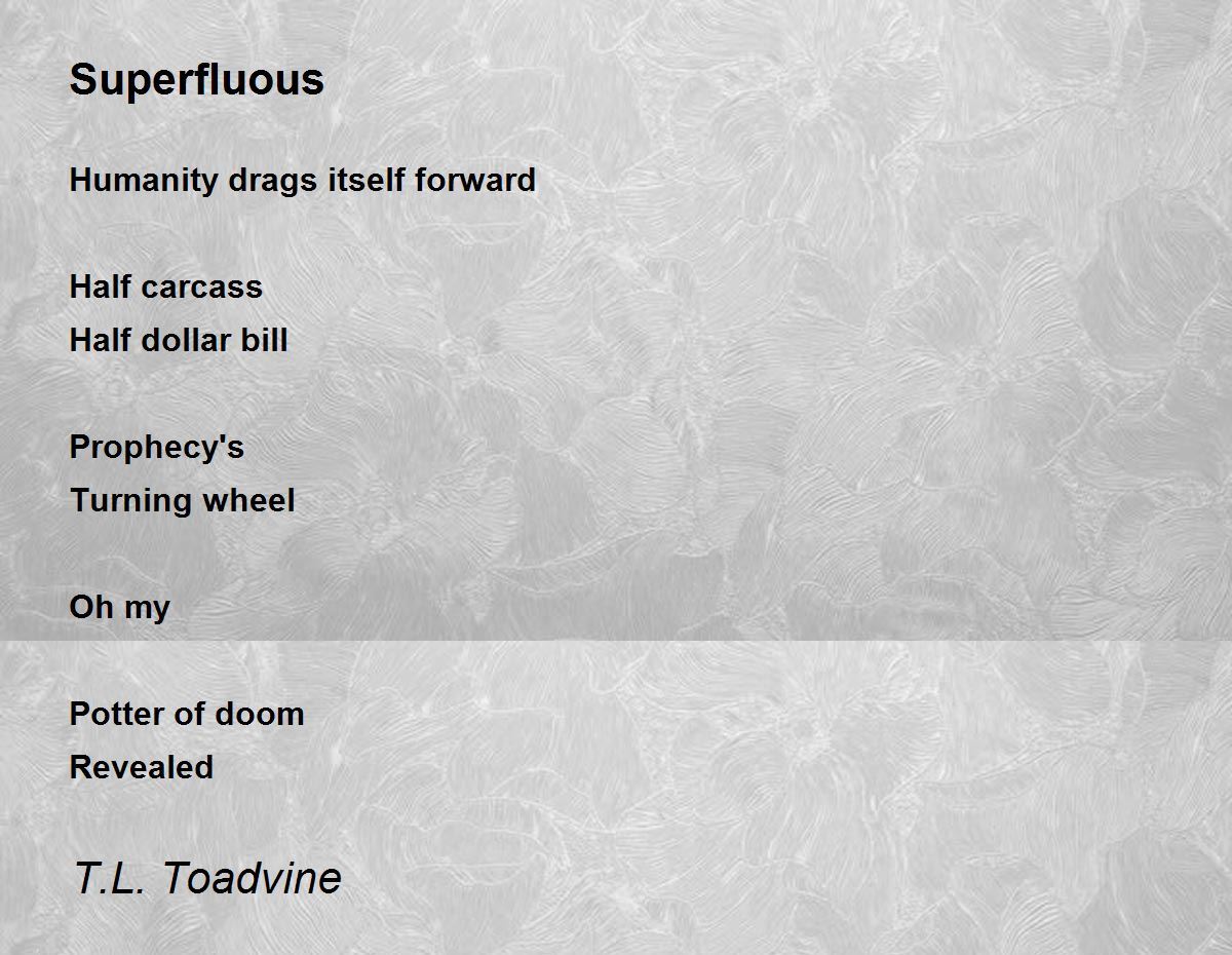 Humanity drags itself forward Half carcass Half dollar bill Prophecy's Turning wheel Oh my Potter of doom Revealed
