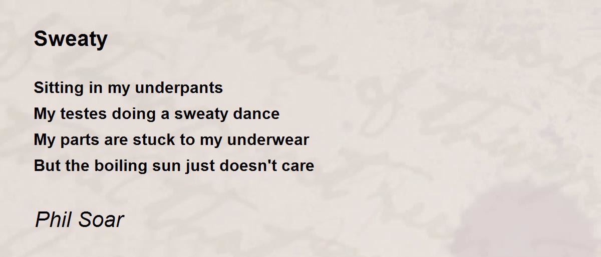 Sitting in my underpants My testes doing a sweaty dance My parts are stuck to my underwear But the boiling sun just doesn't care