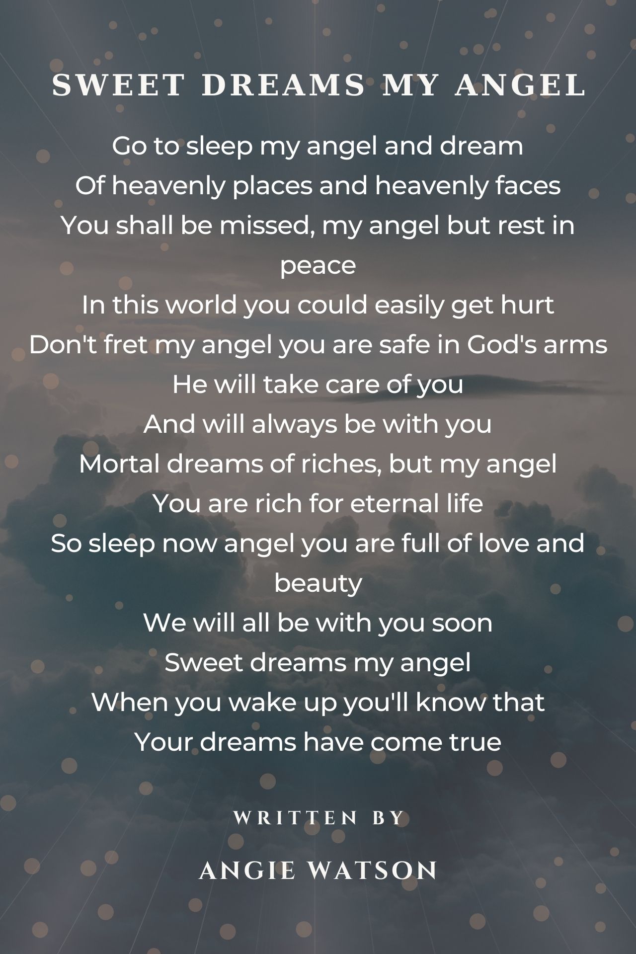 Sweet dreams my angel I can't stop singing this song My tears are accompanied by smiles For you won’t feel pain again I shed tears when I first read this poetry because it reminded me of someone. I like the way you placed the words, and I think these are the best words to cheer someone up. Thanks a lot, for making me to smile instead of crying.
