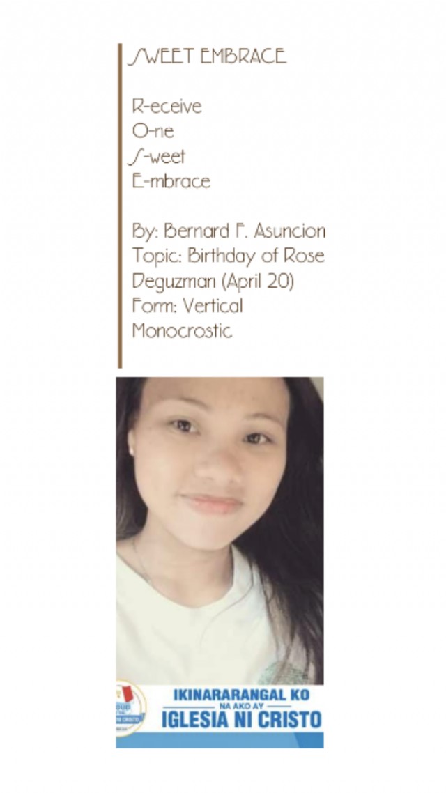 R-eceive O-ne S-weet E-mbrace Topic: Birthday of Rose Deguzman (April 20) Form: Vertical Monocrostic