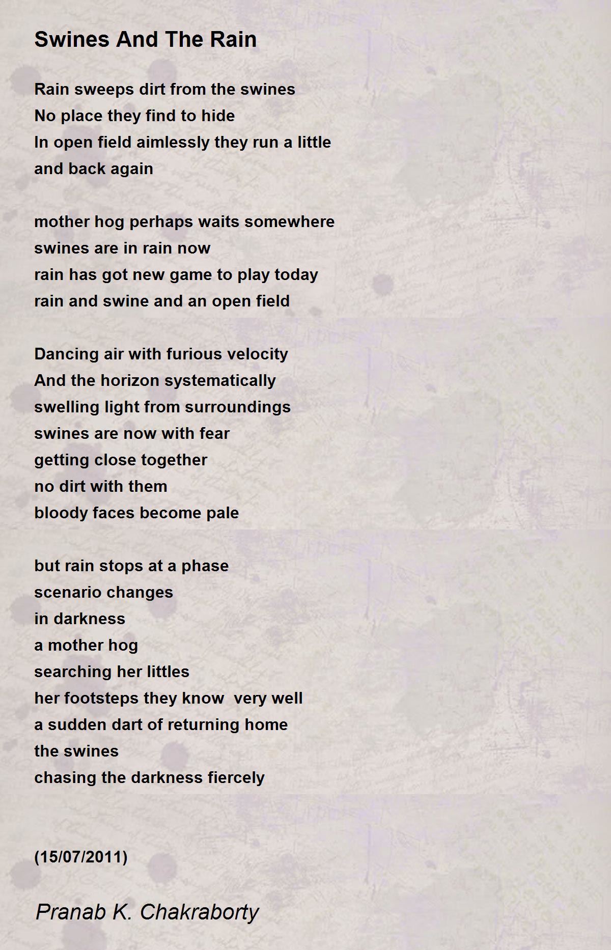 This comment sent by AMIT ROTHSCHILD to Pranab K, Chakraborty when its Title was 'RAIN AND SWINE'. Title of the same writing has been edited by me and it will not effect the comment I think: Swines or pigs piggybanking their pleasure of piggydaising a rain lashed day until the darkness created by the dark clouds or its dusk when they have to all go stywards.Until one day they are slayed to be served as salaamis, pork-bellies, chorizzos, hams(german-schinken) whatever we apprehend for the meat.Pigs are anecdotes and symbolic of savings in money.With pigs people mud-sling each other.Perhaps rain would have been sharing this pain to drench their muds and dirts down.Lightning or the uselessness of human self in the form of death is only to signify the essence of togetherness before being lost this way or another.But its end to life be it an animal like pig or instance or us social.Life is only until the last breath.In Germany pigs started after first world war the beer drinking story.After Germany lost to England and France in WW1-1914-1919..and german administration was destroyed, tonnes of pork bellies were US imports to Germany for its appetit but all it was affected with virus salmonella.This led to acute deaths and paralyses in Germany and the water also got contaminated.Since then the nationwide introduction of drinking beer in magnification and beer culture bingeing everytime serving alcohol chastity as also durch(german-thirst) .Rain is sometimes reminder of stories when life becomes standstill and look through its past.This poem is a notable rememberance of many such stories.