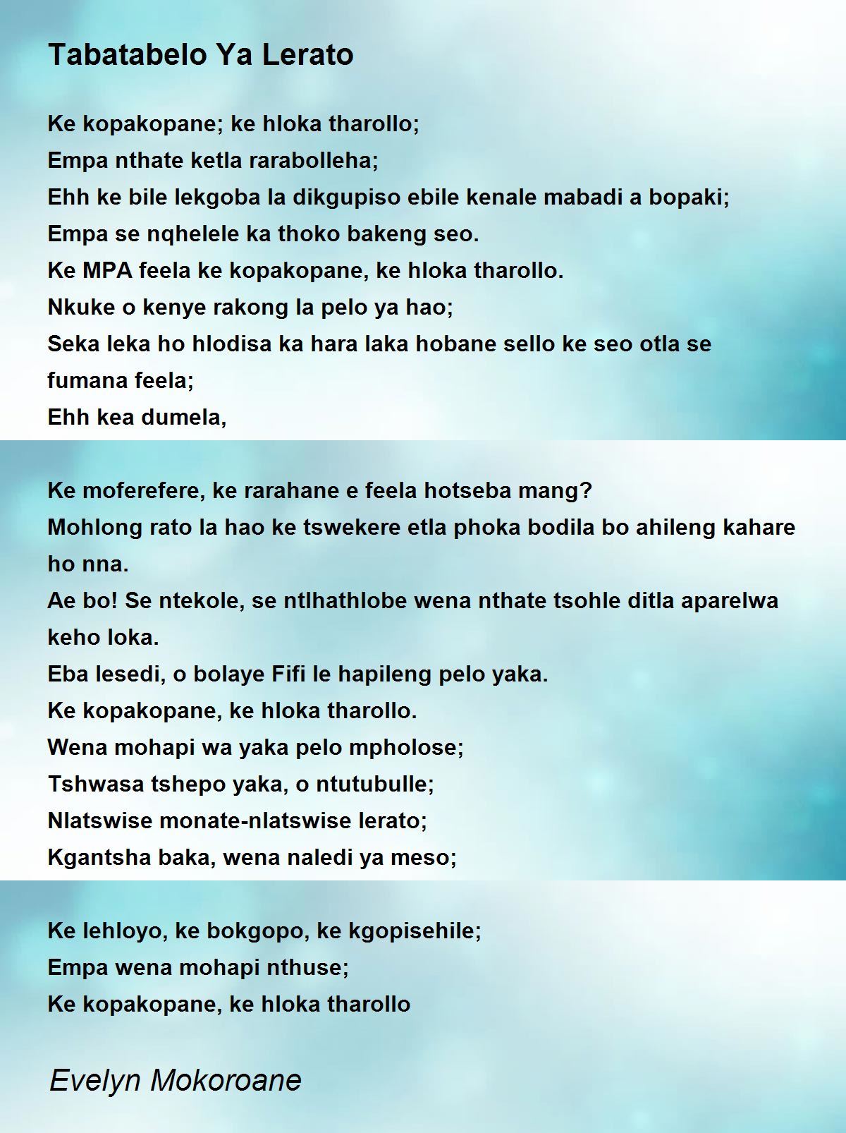 Ae bo! Se ntekole, se ntlhathlobe wena nthate tsohle ditla aparelwa keho loka.