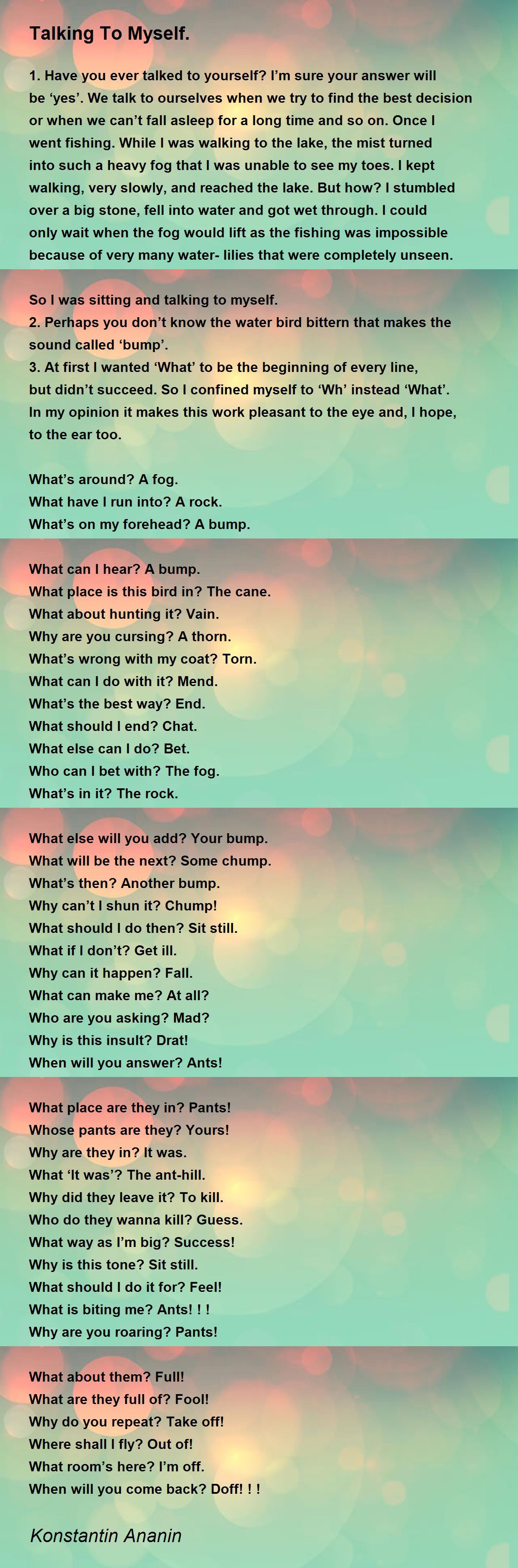 1. Have you ever talked to yourself? I’m sure your answer will be ‘yes’. We talk to ourselves when we try to find the best decision or when we can’t fall asleep for a long time and so on. Once I went fishing. While I was walking to the lake, the mist turned into such a heavy fog that I was unable to see my toes. I kept walking, very slowly, and reached the lake. But how? I stumbled over a big stone, fell into water and got wet through. I could only wait when the fog would lift as the fishing was impossible because of very many water-lilies that were completely unseen. So I was sitting and talking to myself.