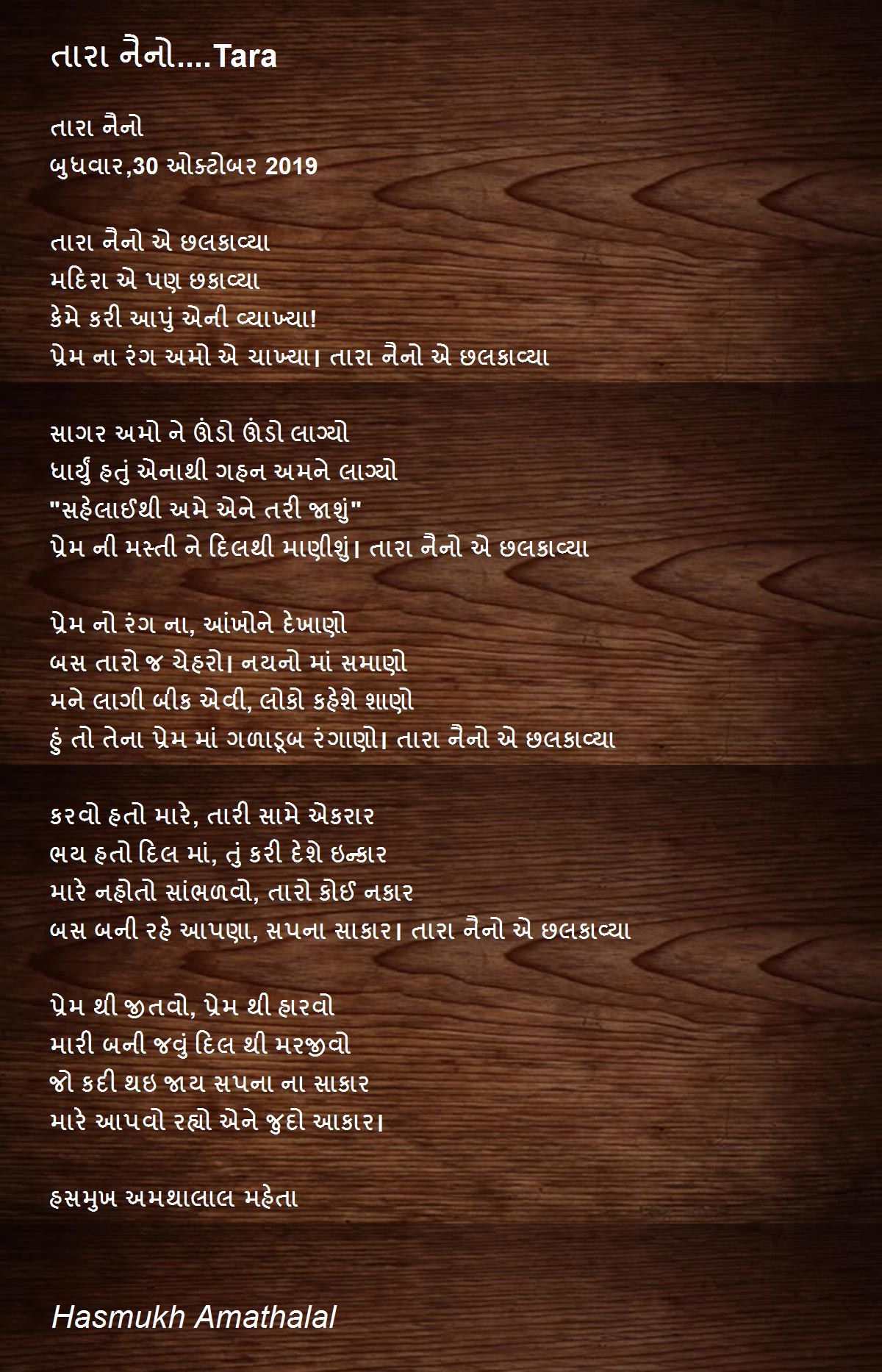 પ્રેમ થી જીતવો, પ્રેમ થી હારવો મારી બની જવું દિલ થી મરજીવો જો કદી થઇ જાય સપના ના સાકાર મારે આપવો રહ્યો એને જુદો આકાર। હસમુખ અમથાલાલ મહેતા