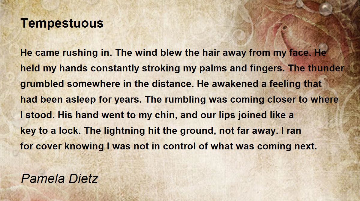 He came rushing in. The wind blew the hair away from my face. He held my hands constantly stroking my palms and fingers. The thunder grumbled somewhere in the distance. He awakened a feeling that had been asleep for years. The rumbling was coming closer to where I stood. His hand went to my chin, and our lips joined like a key to a lock. The lightning hit the ground, not far away. I ran for cover knowing I was not in control of what was coming next.