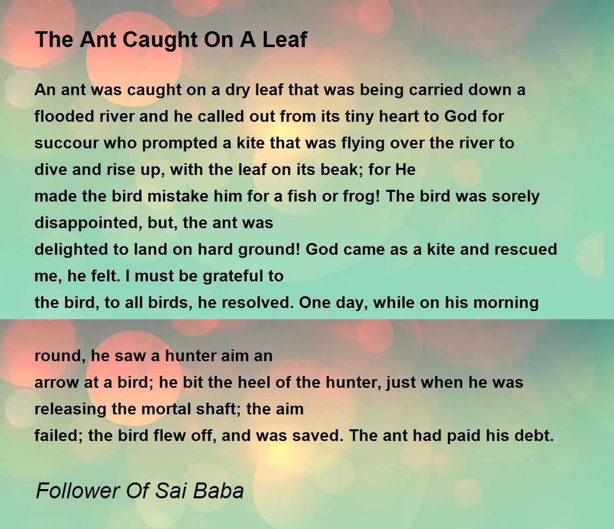 An ant was caught on a dry leaf that was being carried down a flooded river and he called out from its tiny heart to God for succour who prompted a kite that was flying over the river to dive and rise up, with the leaf on its beak; for He