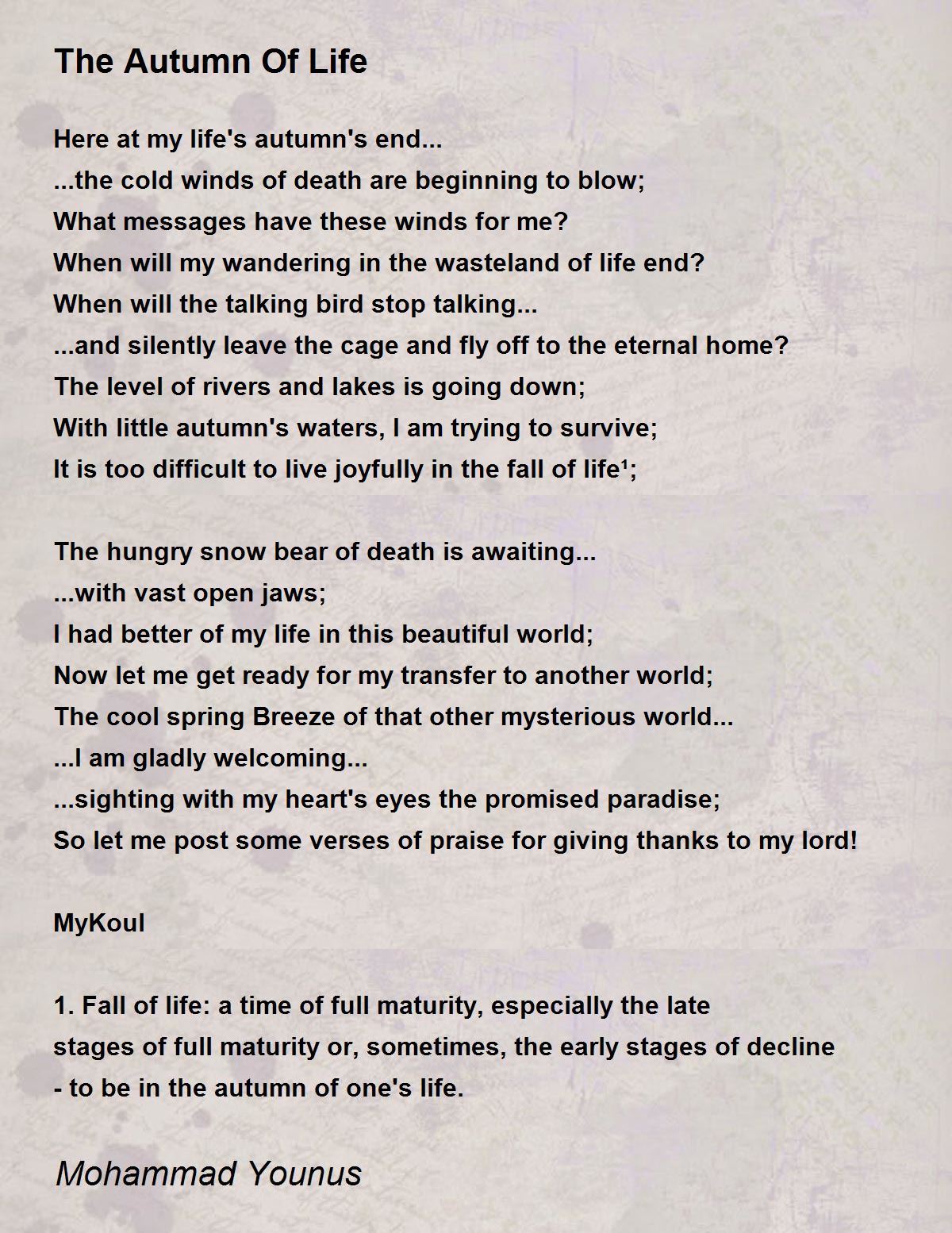 1. Fall of life: a time of full maturity, especially the late stages of full maturity or, sometimes, the early stages of decline - to be in the autumn of one's life.