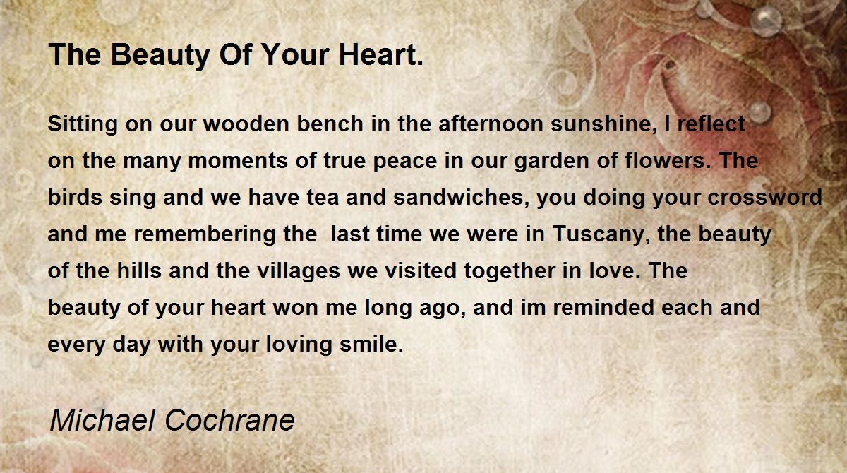 Sitting on our wooden bench in the afternoon sunshine, I reflect on the many moments of true peace in our garden of flowers. The birds sing and we have tea and sandwiches, you doing your crossword and me remembering the last time we were in Tuscany, the beauty of the hills and the villages we visited together in love. The beauty of your heart won me long ago, and im reminded each and every day with your loving smile.