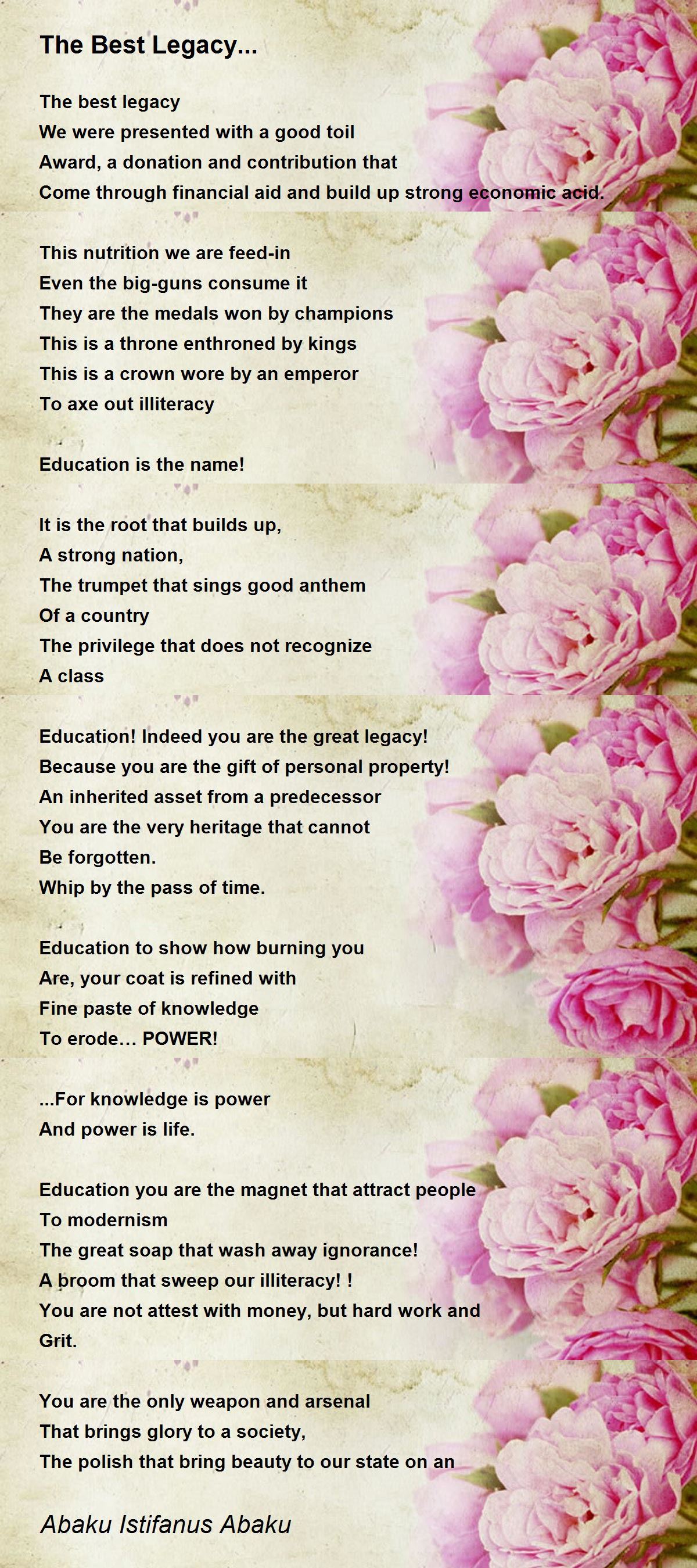 Best penmanship on legacy and education based on hope. I appreciated this poem. Thanks for sharing this valuable piece.....10