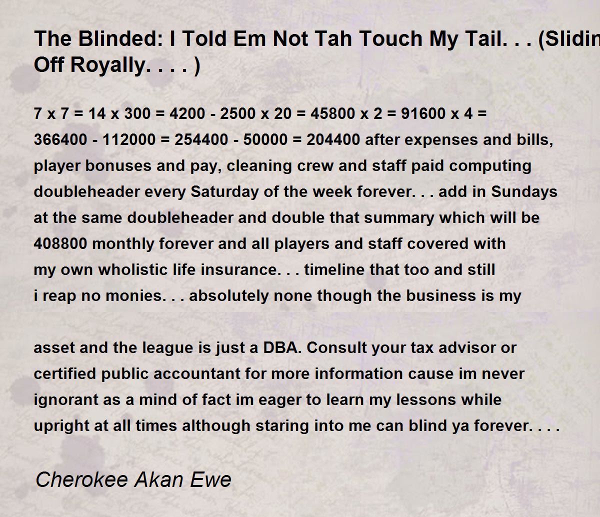 7 x 7 = 14 x 300 = 4200 - 2500 x 20 = 45800 x 2 = 91600 x 4 = 366400 - 112000 = 254400 - 50000 = 204400 after expenses and bills, player bonuses and pay, cleaning crew and staff paid computing doubleheader every Saturday of the week forever... add in Sundays at the same doubleheader and double that summary which will be 408800 monthly forever and all players and staff covered with my own wholistic life insurance...timeline that too and still i reap no monies... absolutely none though the business is my asset and the league is just a DBA. Consult your tax advisor or certified public accountant for more information cause im never ignorant as a mind of fact im eager to learn my lessons while upright at all times although staring into me can blind ya forever....