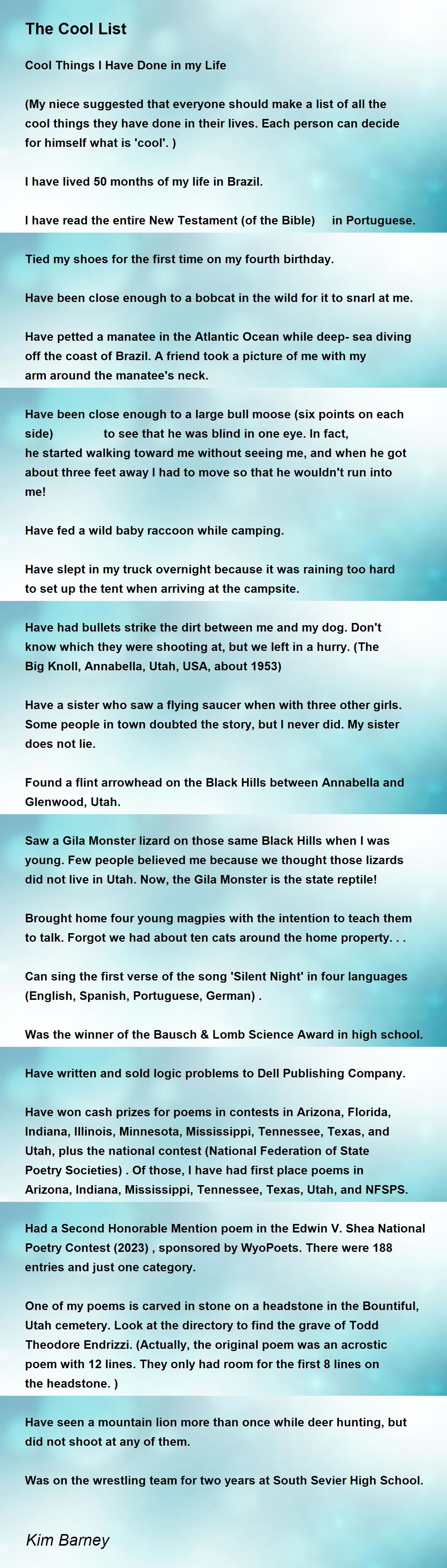 (My niece suggested that everyone should make a list of all the cool things they have done in their lives. Each person can decide for himself what is 'cool'.)