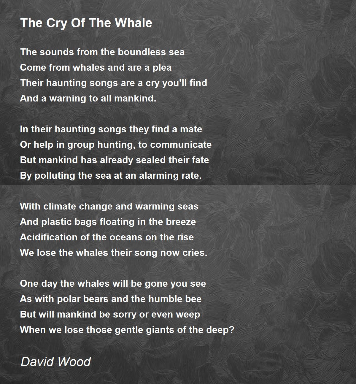 Ohh noo we don't want to lose those great gentle giants, their cries do sound like laments. I hope your awesome poem inspires more to save the creatures and may more help save the planet. Kudos for this great one!