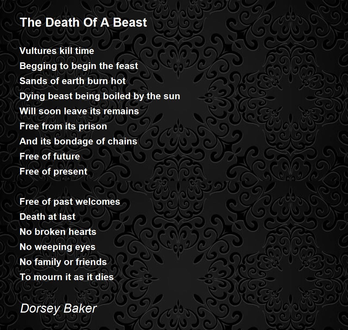 A very thought-provoking Masterpiece, the death of the Beast! 5 Stars fuulest on Top fior this sensational poem!