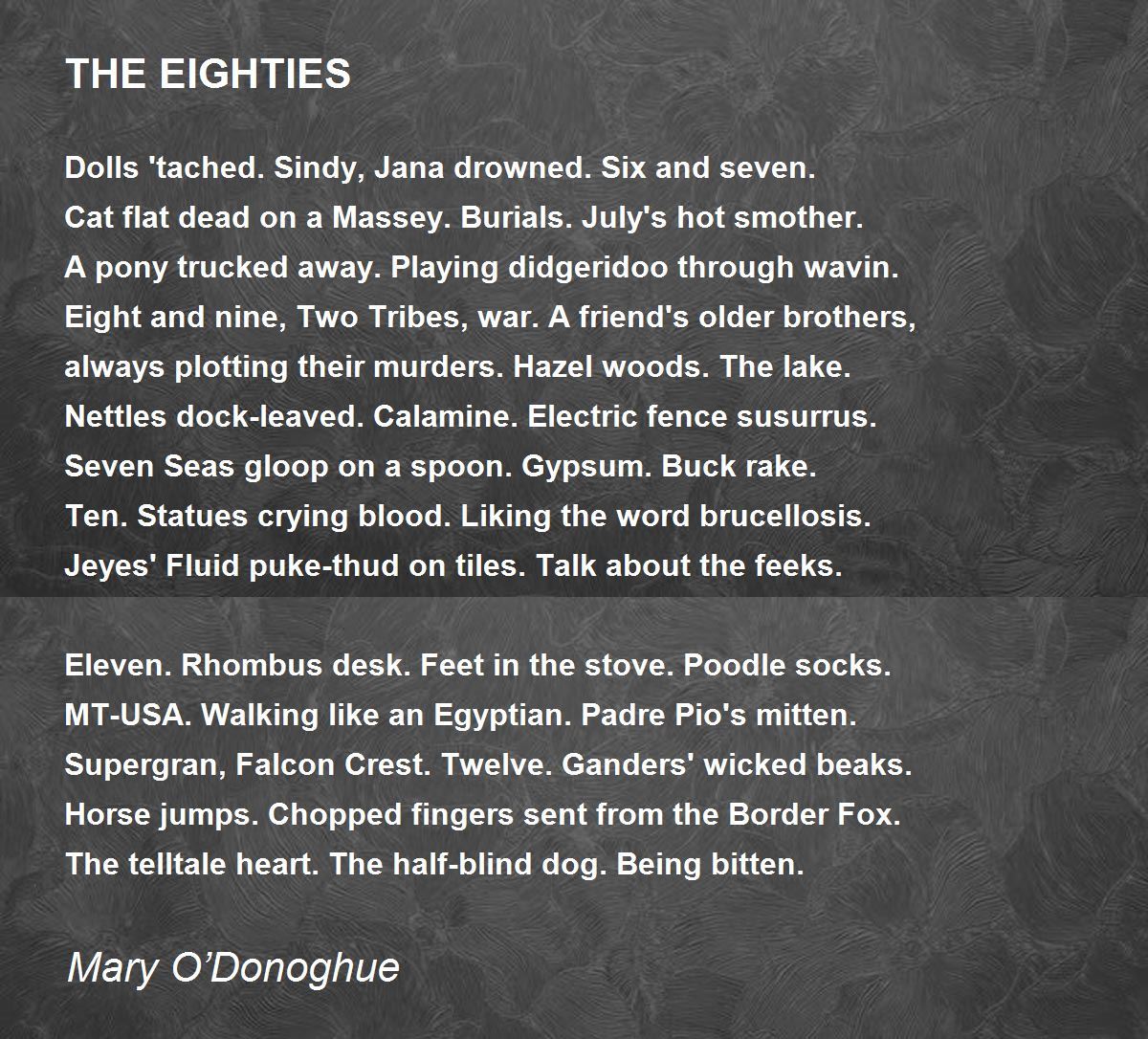 Ten. Statues crying blood. Liking the word brucellosis.