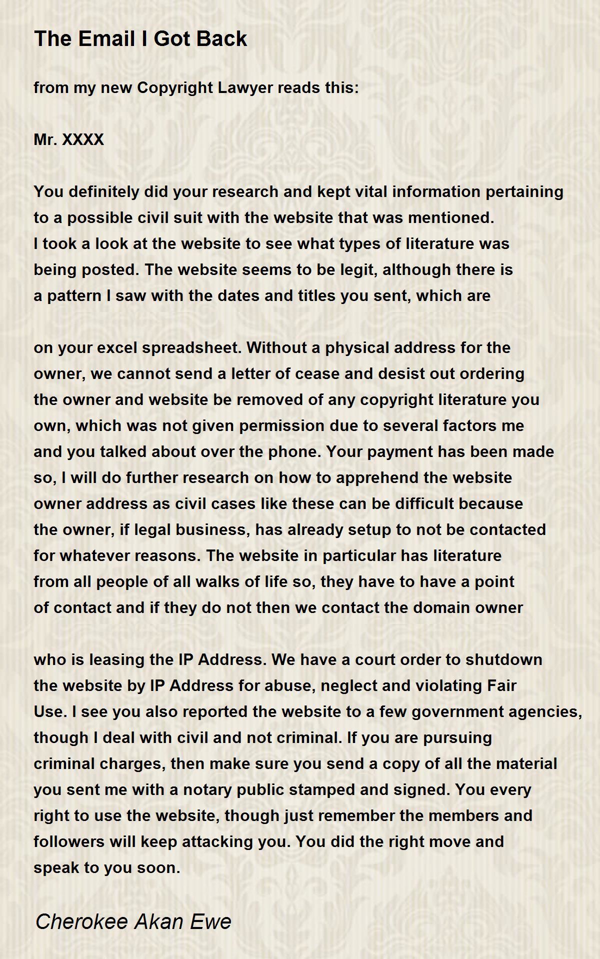 You definitely did your research and kept vital information pertaining to a possible civil suit with the website that was mentioned. I took a look at the website to see what types of literature was being posted. The website seems to be legit, although there is a pattern I saw with the dates and titles you sent, which are on your excel spreadsheet. Without a physical address for the owner, we cannot send a letter of cease and desist out ordering the owner and website be removed of any copyright literature you own, which was not given permission due to several factors me and you talked about over the phone. Your payment has been made so, I will do further research on how to apprehend the website owner address as civil cases like these can be difficult because the owner, if legal business, has already setup to not be contacted for whatever reasons. The website in particular has literature from all people of all walks of life so, they have to have a point of contact and if they do not then we contact the domain owner who is leasing the IP Address. We have a court order to shutdown the website by IP Address for abuse, neglect and violating Fair Use. I see you also reported the website to a few government agencies, though I deal with civil and not criminal. If you are pursuing criminal charges, then make sure you send a copy of all the material you sent me with a notary public stamped and signed. You every right to use the website, though just remember the members and followers will keep attacking you. You did the right move and speak to you soon.