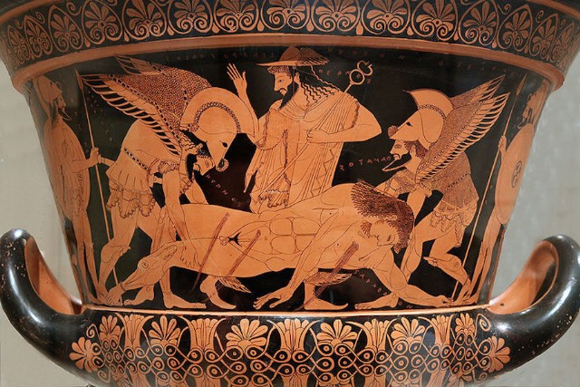 'A red-figure vase, circa 515 BCE, signed by the potter and the painter who created it. The obverse depicts the death of Sarpedon, king of Lycia. Having no quarrel with the Achaeans, he fought bravely alongside his Trojan allies, and was slain by Patroclus, who was clad in the armor of Achilles.'