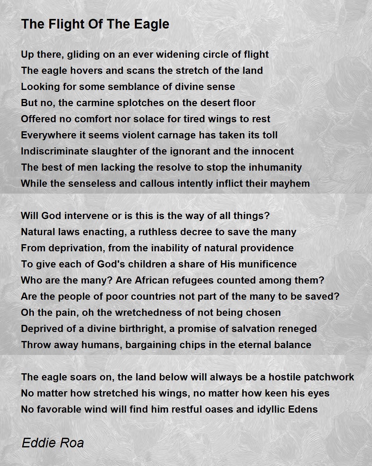 From the eagle's eye you have seen the scenes of inhumanity on the land below. A great poem of your style and diction, Eddie..............10/10. Best Regards Naseer