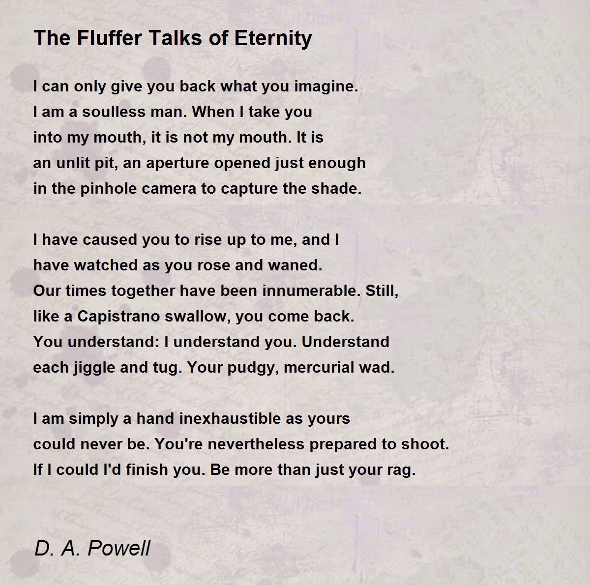each jiggle and tug. Your pudgy, mercurial wad.