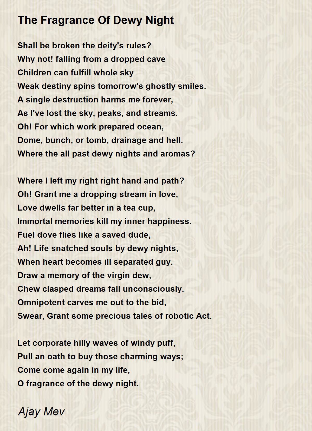 mmortal memories kill my inner happiness. Fuel dove flies like a saved dude, comoe again in my life the fragrance of the dewy night. vry poetic dear poet Ajay....... very nice, enjoyed reading your poem. tony