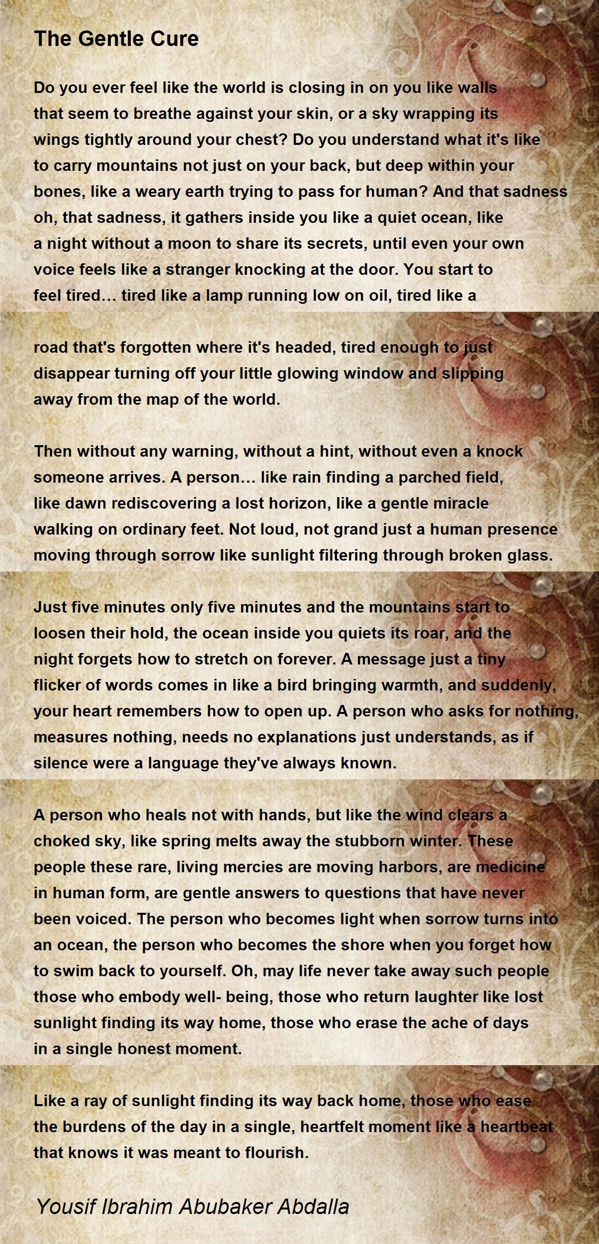Do you ever feel like the world is closing in on you like walls that seem to breathe against your skin, or a sky wrapping its wings tightly around your chest? Do you understand what it's like to carry mountains not just on your back, but deep within your bones, like a weary earth trying to pass for human? And that sadness oh, that sadness, it gathers inside you like a quiet ocean, like a night without a moon to share its secrets, until even your own voice feels like a stranger knocking at the door. You start to feel tired… tired like a lamp running low on oil, tired like a road that's forgotten where it's headed, tired enough to just disappear turning off your little glowing window and slipping away from the map of the world.